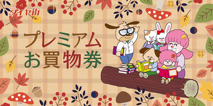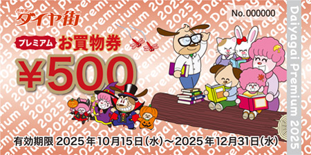 ダイヤ街でのお買物やお食事がおトクに楽しめる 「プレミアムお買物券」。 500円券が24枚綴り(12,000円分) で価格は10,000円です。
